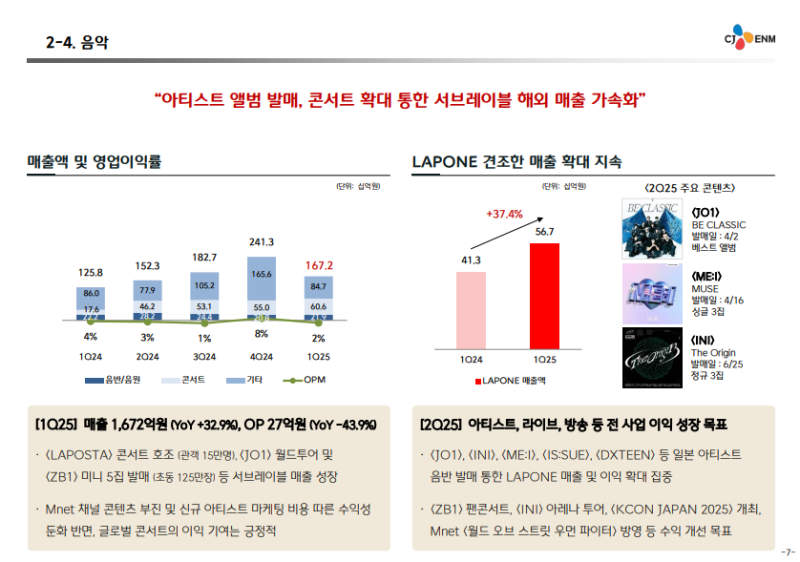 -2025년 1분기에는 LAPIONE INI의 투어 부재에도 불구하고 ZB1의 앨범 판매와 ATEEZ 콘서트 매출이 발생하면서 매출 성장