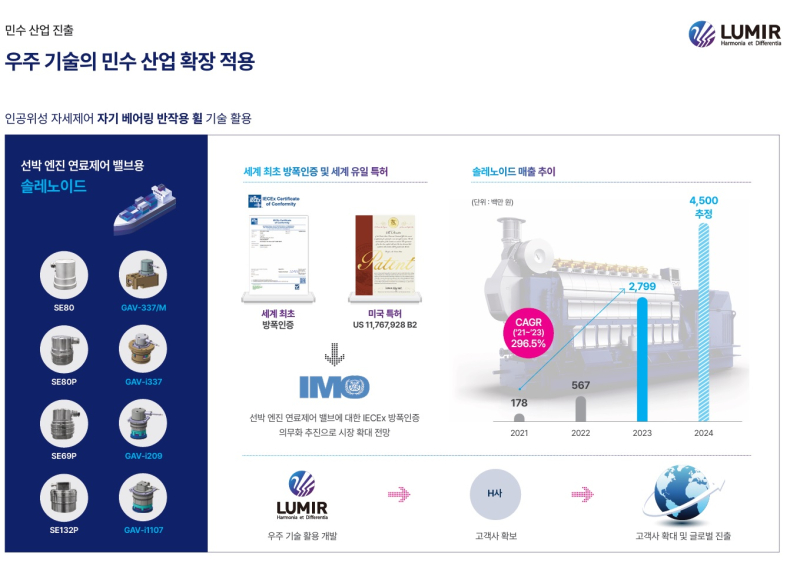 루미르는 인공위성의 자세를 제어하는 구동기 기술을 민수 산업에 적용, 대형 선박 엔진의 능동 연료제어 밸브에 사용되는 '솔레노이드' 장치를 개발했다. 이 제품은 세계 최초로 방폭인증을 획득하고, 관련 기술로는 세계에서 유일하게 미국 특허를 보유하고 있어 높은 기술적 해자를 구축했다는 평가를 받는다.