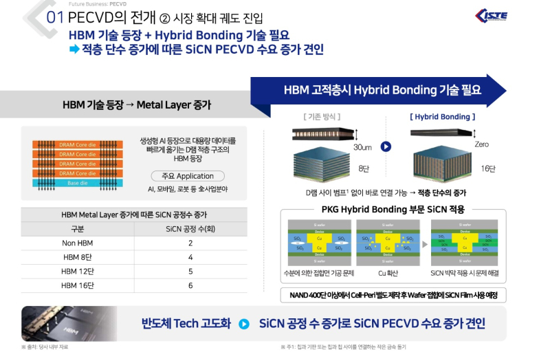 KB증권에 따르면 SiCN-PECVD 공정은 Cu 신호 지연 개선 및 Cu의 확산을 막기 위해 필요하며, 반도체 미세화 및 HBM의 고단화 및 하이브리드 공정 도입에 따라 SiCN PECVD 공정의 Step 수는 증가할 것으로 예상된다.