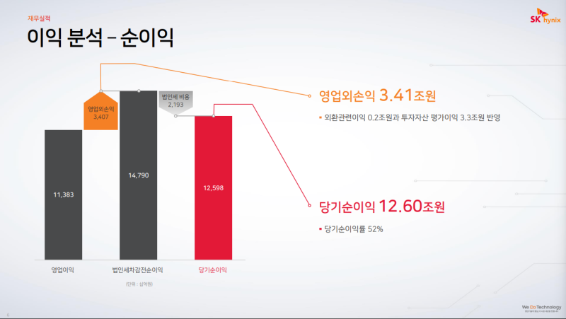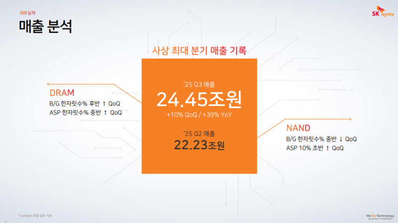 • HBM과 고성능 일반 디램, 엔터프라이즈 SSD 중심의 판매 확대에 따라 영업이익은 창사 이후 처음으로 분기 기준 10조원 돌파