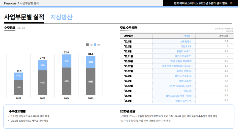 • 3분기 말 기준 지상방산 부문 수주 잔고는 약 31조 원