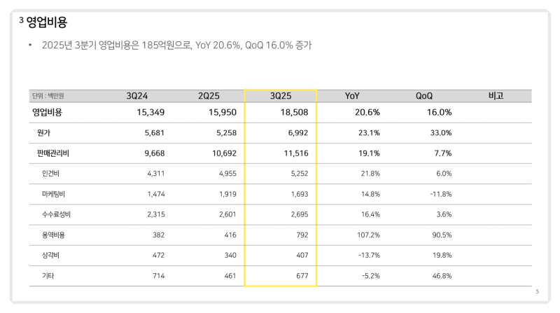 • 25년 3분기 영업비용은 185억 기록, 원가는 70억·판관비는 115억 기록