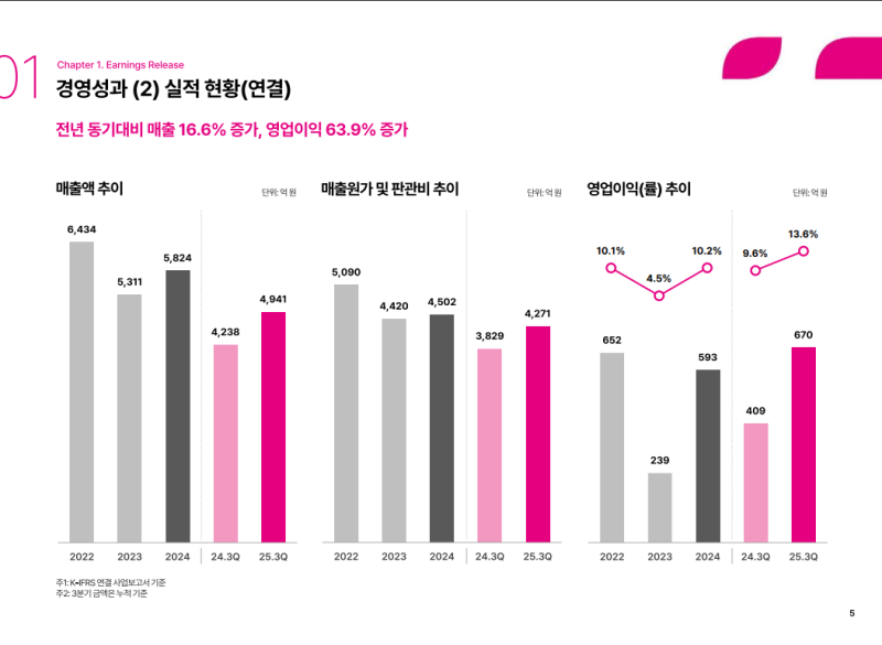 • 연결 매출원가 및 판관비 : 4,271억 원(YoY +11.5 %)