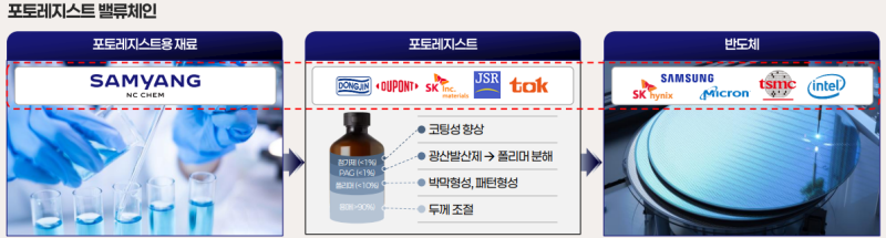 PR은 반도체 회로를 웨이퍼에 새기는 노광 공정의 핵심 소재로, 삼양엔씨켐은 PR 생산의 원료와 중간체를 공급하는 핵심 밸류체인을 구축하고 있다.