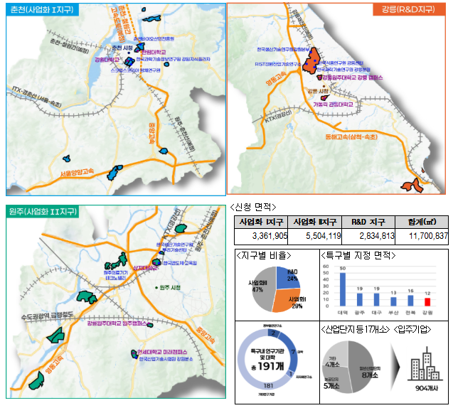 전체 면적은 총 11.7㎢(약 353만평) 규모로, 기존에 운영되던 춘천 강소연구개발특구는 이번 광역 특구 체제 내로 통합된다.