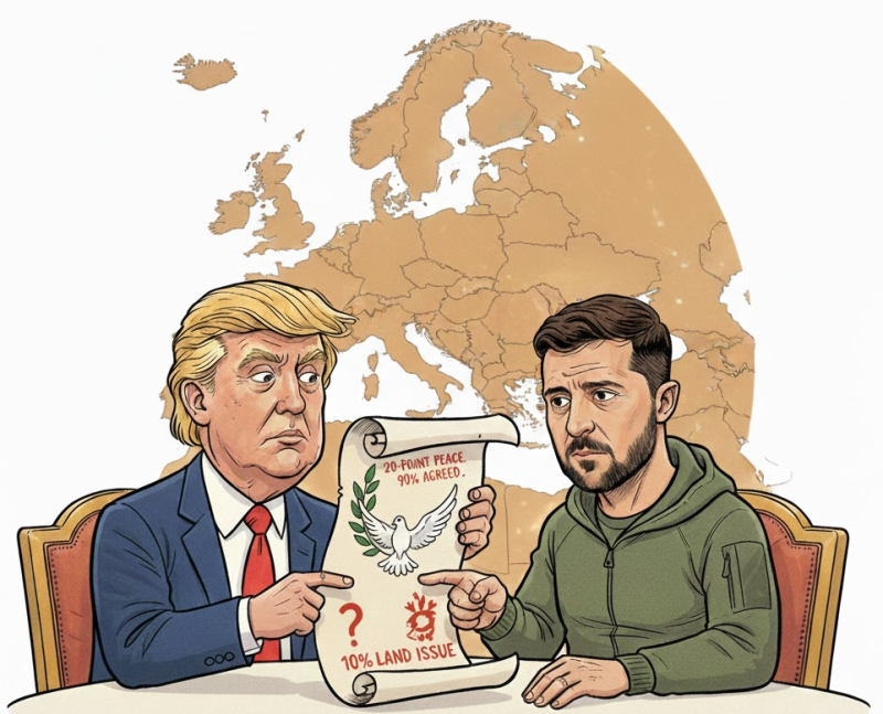 함께 자리한 젤렌스키 대통령은 20개 항목으로 구성된 평화안에 대해 "이 중 약 90%는 양측 팀이 이미 합의를 마친 상태"라고 설명하며 "이번 회담이 가능한 한 빠르게 실제 평화로 이어지길 바란다"고 말했다.