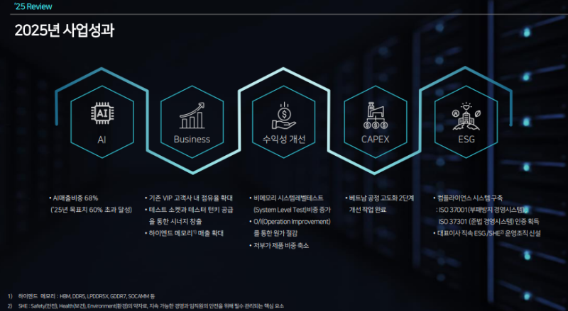 • 시스템 레벨 테스트와 AI HBM 테스트 비중 확대가 마진 구조에 긍정적으로 작용