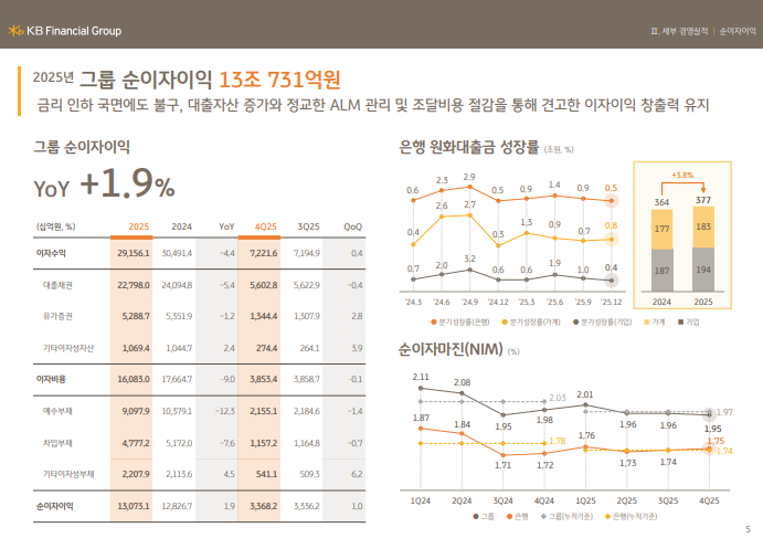 • 2025년 연간 그룹 NIM 1.97%, 은행 NIM 1.74%, 전년 대비 소폭 하락