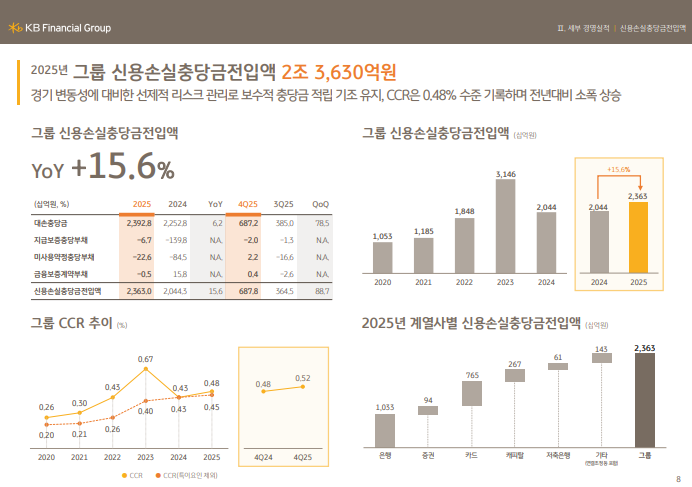 • 2025년 신용손실충당금 전입액 2조 3,630억 원 (YoY +15.6%, +3,187억 원), 2025년 그룹 Credit Cost 48bp