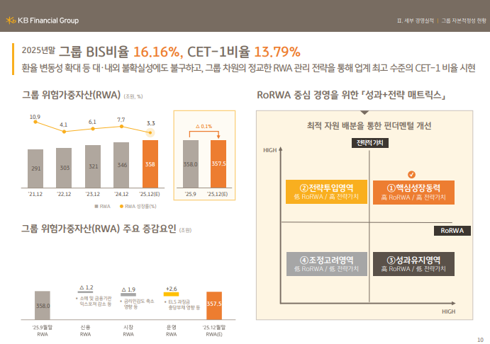 • 금리·환율 변동성 등 RWA 영향 요인 존재, 25년 RWA 증가율 관리 경험 기반 한도 모니터링 및 포트폴리오 조정, 그룹 차원 정교한 RWA 관리 전략 지속, 증가율 적정 수준 관리