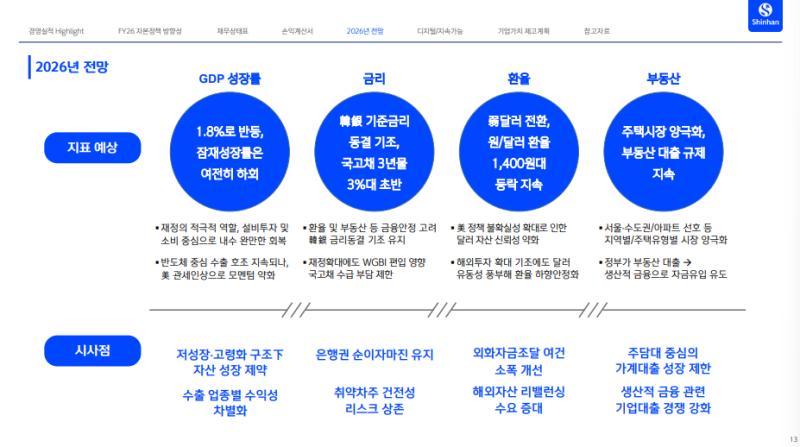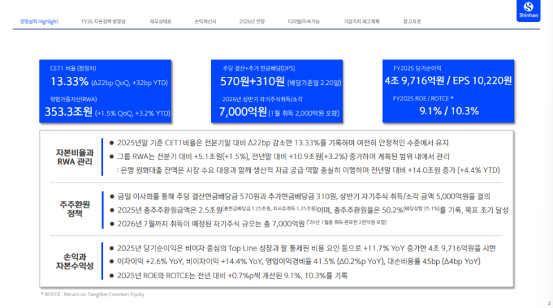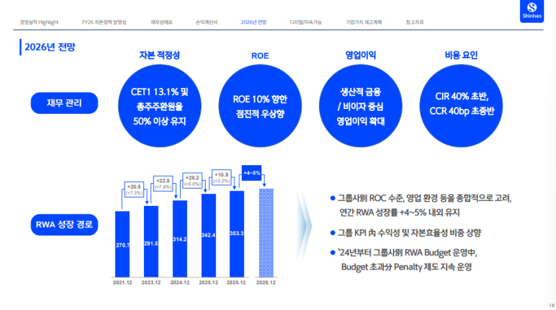 • 2025년 말 기준 그룹 CET1 비율 13.33% 잠정 집계, 환율 상승에도 불구하고 그룹 RWA 계획 범위 내 관리