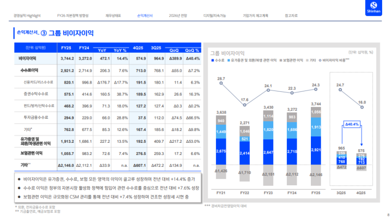 • 그룹 연간 당기순이익 4조 9,716억 원(YoY +11.7%), 비이자 중심 영업이익 성장, ELS 등 과징금 인식에도 불구 비용 요인 통제