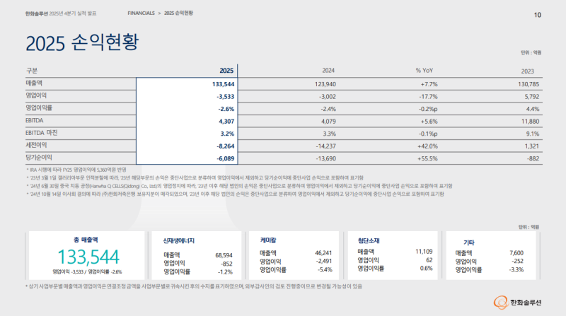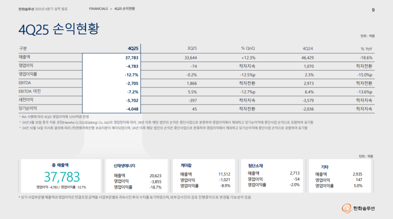 • 영업이익 -4,783억 원(QoQ 적자지속, YoY 적자전환), 신재생에너지 부문 수익성 악화 영향