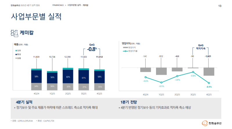 • 4Q25 전기 정기보수 진행 및 판매량 감소와 주요 제품 가격 하락에 따른 스프레드 축소 영향으로 적자 폭 확대
