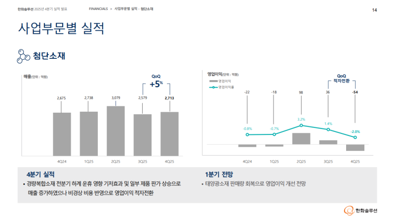 • 영업이익에 태양광 불용 재고 및 원부자재 손상, 차손, 충당금 설정, 첨단소재 인건비 관련 비경상 비용 등 약 1,000억 원 일회성 비용 반영