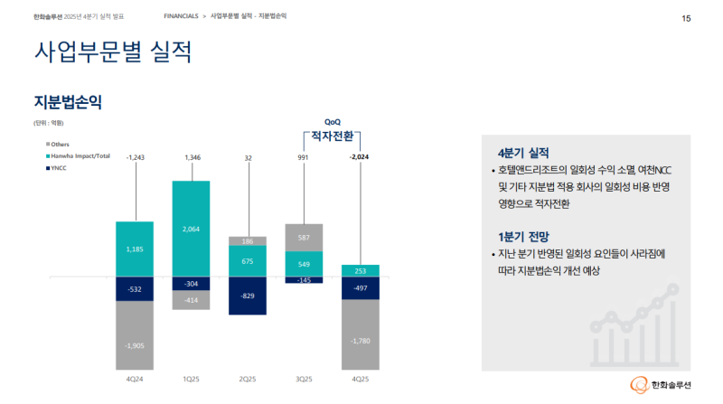 • 4Q25에는 전 분기에 반영되었던 호텔앤리조트 일회성 수익이 소멸되었고, 여천NCC 정기보수 진행 및 가동 정지 등에 따른 손상차손이 반영되면서 지분법손익 -2,024억 원 기록하며 전분기 대비 적자전환
