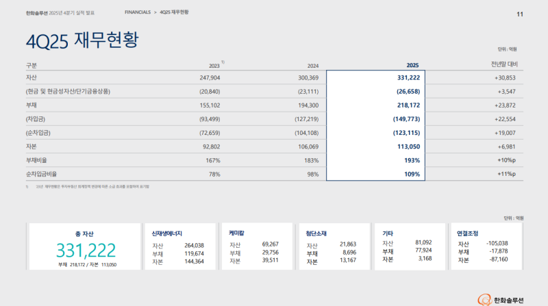 • 2026년 CAPEX 약 1.2조 원 계획, 신재생에너지 부문 1조 원, 케미칼 및 기타 부문 2천억 원 집행 예정