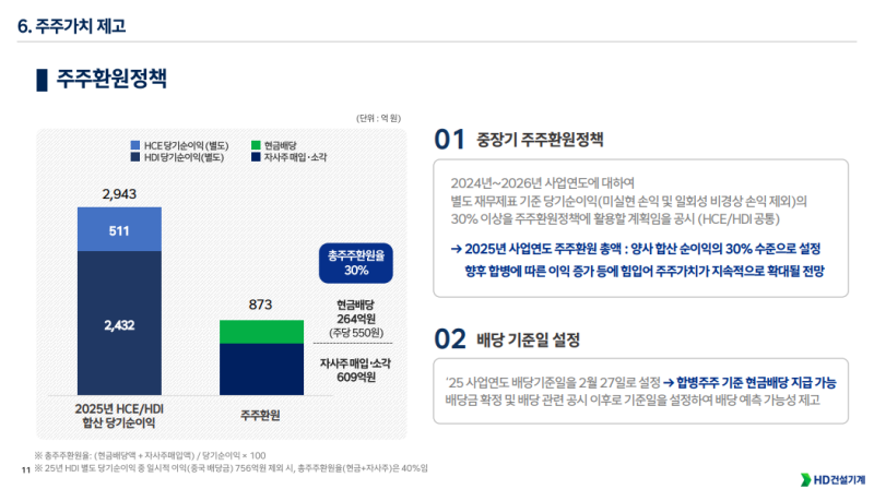 • 2025년에도 동일 기준 적용, 양사 합산 순이익의 30% 수준인 873억 원을 주주환원 재원으로 결정