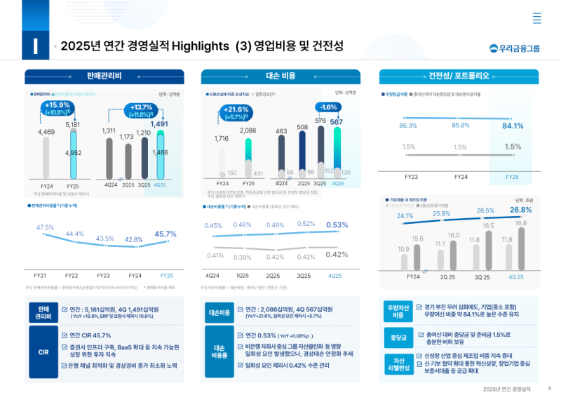 • 2025년 당기순이익 3조 1,413억 원으로 YoY +1.8%, 그룹 ROE 9.1% 기록