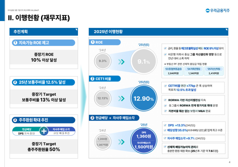 • CET1 12.9%로 YoY +77bp, 보험사 인수·주주환원 확대에도 12.5% 목표 초과 달성