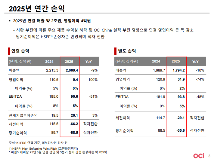 • 중국 카본블랙 생산 법인 오제이씨(OJCB) 청산 관련 재고 및 유무형자산 손상 반영으로 4Q25 일회성 비용 발생