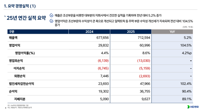 • HD현대 4Q25 영업이익 1조9,719억 원 기록 (QoQ +15.8%, YoY +124.5%)하며 조선·정유·전력기기 전반 실적 개선 확인