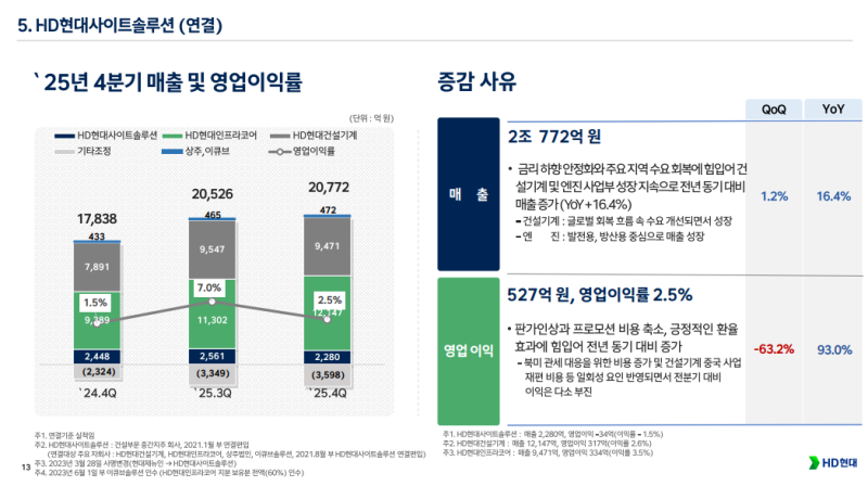 • HD현대사이트솔루션 4Q25 영업이익률 2.5% 기록, 인프라코어·건설기계 합병 과정에서 발생한 비용이 연말 반영