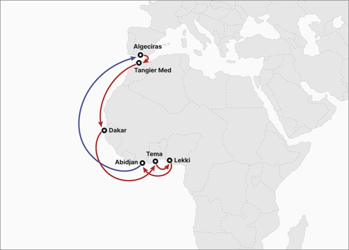 왕복 운항에는 총 35일이 소요되며 기항지는 알헤시라스, 탕헤르, 다카르, 테마, 레키, 아비장 순이다.