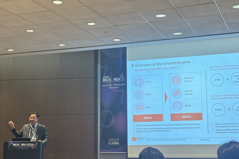 이 대표는 28일 서울 삼성동 코엑스에서 열린 바이오코리아 2026 '올리고뉴클레오타이드 치료제: 통합 비임상 개발을 위한 전략 로드맵'에서 <간 및 간외 질환에 대한 RNAi 치료제 개발>을 주제로 발표를 진행했다.